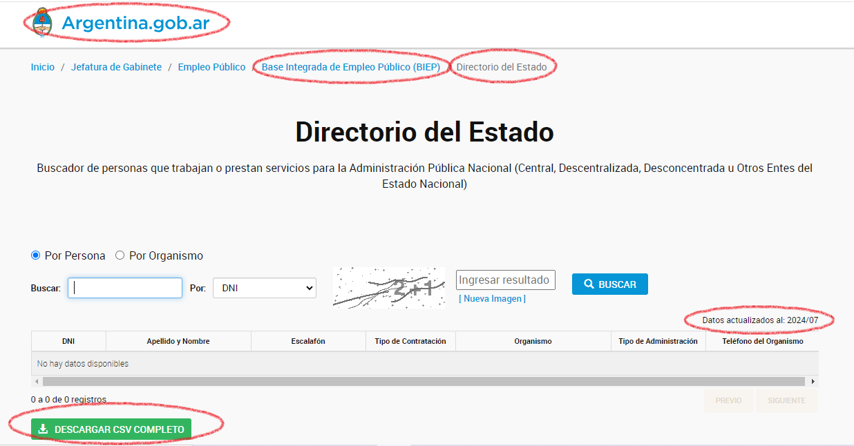 - De modo amplio, la Administración Central de la Nación, publica el listado de todos sus agentes. Los datos accesibles para cualquier persona, contienen DNI, nombre y apellido, área de trabajo, escalafón y tipo de contratación. Se trata de 423.081 empleados con nombre y apellido, personal de Justicia, Policía, médicos, científicos, fuerzas armadas, organismos de recaudación, todas las dependencias de la Administración Central. La información está disponible en la web. Hay que buscar con el criterio “Base Integrada de Empleo Público (BIEP) / Directorio del Estado”.
