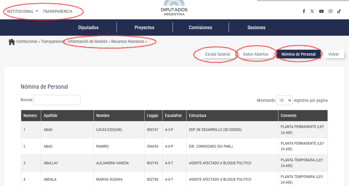 - Las dos cámaras legislativas de la Nación, tanto el Senado como Diputados, hacen públicos sus registros de empleados. En la web de la Cámara de Diputados de la Nación, en el Menú Institucional/Transparencia/Información de Gestión/Recursos Humanos, se encuentra nómina de personal, escala salarial, composición del personal de la Cámara por género y por franja etaria, un verdadero adelanto. Así es público por ejemplo que de la Cámara baja nacional dependen 4.551 personas. Pero esto quiere decir que están los nombre, los números de legajo, bajo qué modalidad laboral y si dependen de algún legislador. La última actualización es de septiembre.