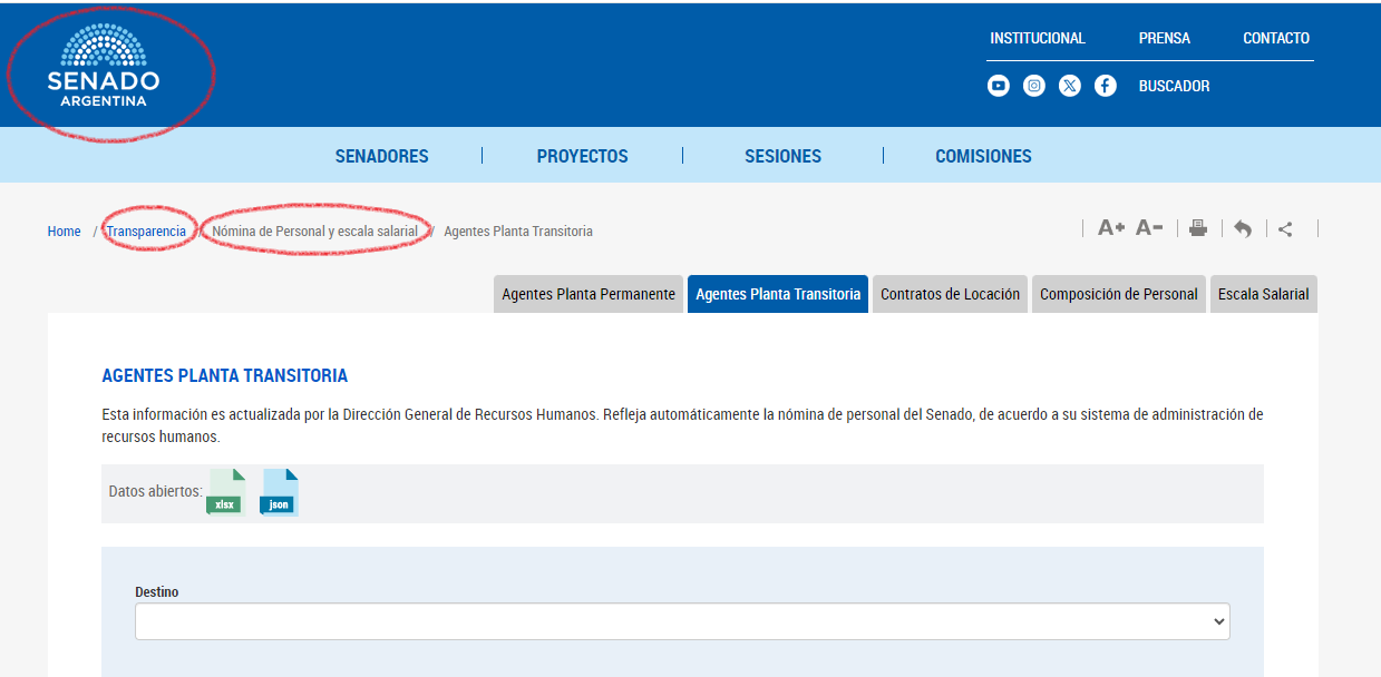 - Lo mismo ocurre en el Senado de la Nación. En la web oficial, el Menú Transparencia/ Nómina de Personal y escala salarial, se encuentra un registro de 1.684 personas como planta transitoria con nombre y apellido, número de legajo, categoría y destino, es decir de quién depende laboralmente. A ese total hay que sumarle otro listado de 2.687 personas en planta permanente, más 370 contratos de locación. Todo hace un total de 4.741 personas que dependen laboralmente de la Cámara alta.