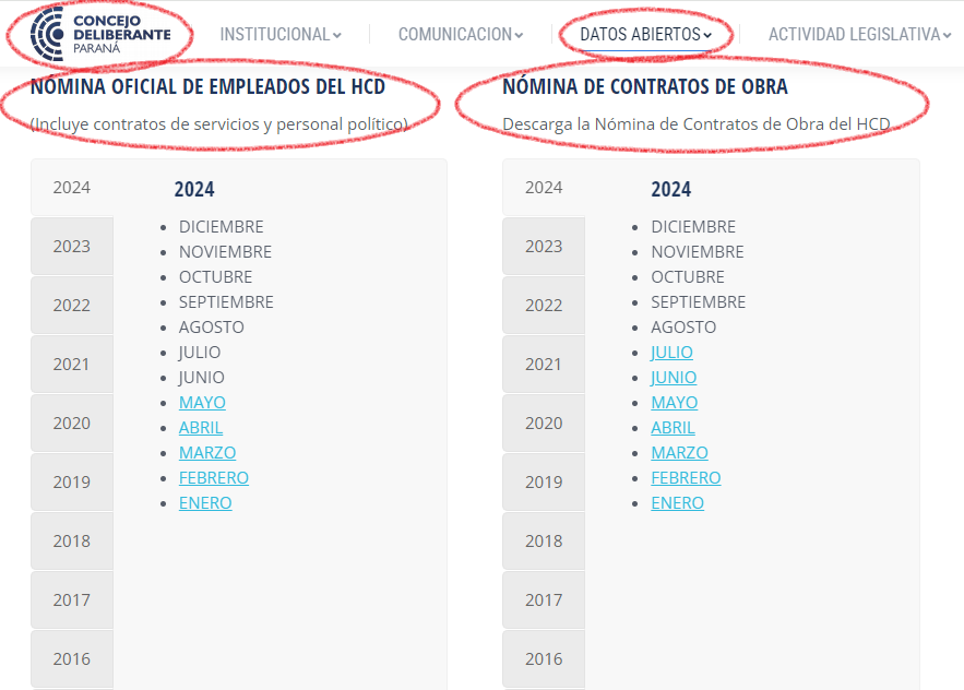 - Concejo Deliberante de Paraná. También se ingresa a la web del Concejo Deliberante, en el menú Datos Abiertos se hallan los listados de empleados y contratados de servicio del Concejo y también el listado de contratados de obra. La última actualización es de mayo. Allí se informa que hay 176 personas que dependen laboralmente del organismo, ya sea porque son planta permanente o contratados de servicio.