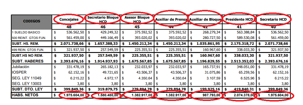 El Concejo Deliberante de Paraná también, en la web oficial, pone a disposición de cualquiera la planilla con la escala salarial de la planta política, con la última actualización de abril pasado. Los haberes netos fueron de 2 millones 074 mil 378 pesos para el presidente del HCD, a 987 mil 793 pesos para un auxiliar de bloque. Cabe subrayar que es la escala de abril de 2024.