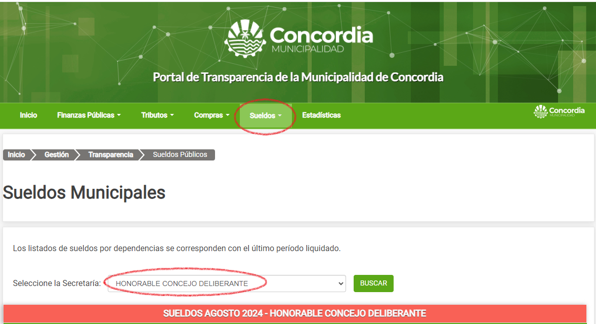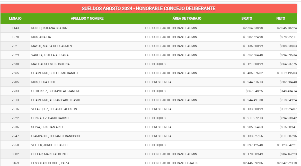 - El Concejo Deliberante de Concordia, al igual que el de Paraná, también publica el listado completo de empleados, incluida la planta política. Es necesario entrar al Portal Transparencia de la Municipalidad de Concordia. En el menú Inicio / Gestión / Transparencia / Sueldos Públicos se ingresa el criterio Honorable Concejo Deliberante y aparece un listado de 103 personas con nombre y apellido, el área de trabajo, el legajo, el sueldo bruto y el sueldo neto. Puede leerse en ese listado que el sueldo de bolsillo más alto es para la secretaria del Concejo Deliberante, con un haber en agosto de 2 millones 654 mil 826 pesos a los salarios más bajos del Concejo Deliberante que en agosto fueron de 162 mil 540 pesos.