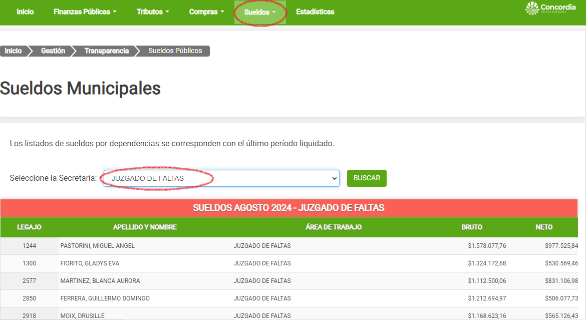 - La misma información puso a disposición el Juzgado de Faltas de Concordia, que publica en el Portal Transparencia de la Municipalidad de Concordia, una nómina de 31 empleados del organismo, con sus números de legajos, sus nombres, sus sueldos brutos y netos. En ese sentido puede verse el haber más abultado de agosto, de 2 millones 276 mil 546 pesos para un fiscal de faltas; y el sueldo más bajo de 193 mil 327 pesos.
