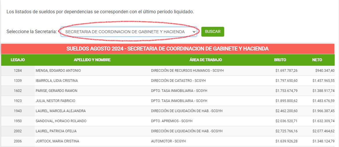 - La Secretaría de Coordinación de Gabinete y Hacienda de la Municipalidad de Concordia, también publica su nómina de empleados y salarios. En el mismo Portal de Transparencia que venimos mencionando, puede verse el listado de 191 agentes, el área donde se desempeñan y los salarios brutos y netos en agosto pasado. Así puede verse que el haber de agosto más elevado fue para el contador municipal, habiendo percibido 3 millones 158 mil 513 pesos; y el salario más bajo para el sector fue de 310 mil 723 pesos.