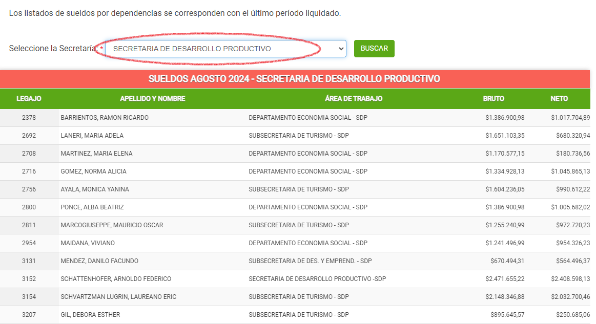 - La Secretaría de Desarrollo Productivo de Concordia también publica una de lista con sus empleados, áreas a las que responden y sueldos brutos y netos a agosto de 2024. Para esa área, según la información disponible en el Portal de Transparencia Municipal, trabajan 114 empleados. El sueldo más alto en agosto fue el del secretario de Desarrollo Productivo con 2 millones 408 mil 598 pesos, contra el más bajo del sector que en agosto fue de 176 mil pesos.