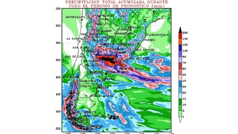 El área será afectada por tormentas aisladas, algunas localmente fuertes. Las mismas estarán acompañadas por abundante caída de agua en cortos períodos, fuerte actividad eléctrica, ocasional granizo y ráfagas que podrían alcanzar los 80 km/h. Se prevén valores de precipitación acumulada entre 30 y 60 mm, pudiendo ser superados en forma puntual.