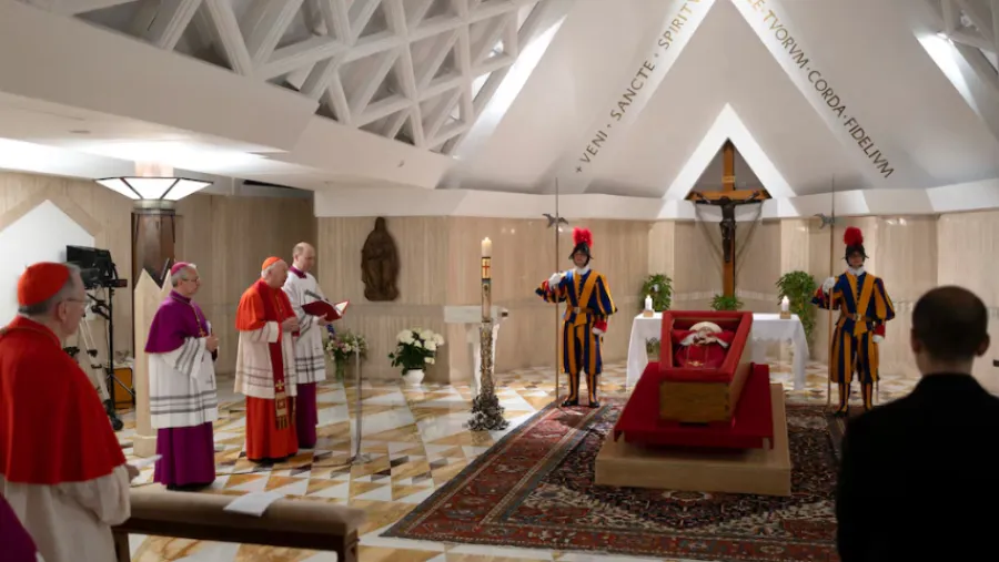 Francisco yace dentro de un féretro de madera forrado en terciopelo rojo, dispuesto en la capilla privada de la residencia, donde permaneció rodeado de sus colaboradores más cercanos y numerosos cardenales presentes en Roma.