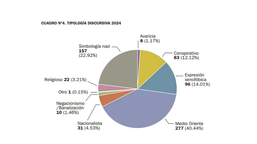 De las 687 denuncias recibidas, el 69% se asociaron a mensajes cuyo contenido atacaba directamente la identidad judía, mezclando antiguos estereotipos con nuevas argumentaciones relacionadas con la geopolítica y los hechos en Medio Oriente. El antisemitismo actual en Argentina muestra, según la DAIA, una fuerte tendencia a la transversalidad ideológica: los discursos de odio son emitidos tanto por sectores de derecha como de izquierda y, en ciertos casos, por agrupaciones vinculadas a universidades. El informe precisa que actores anónimos y figuras públicas participaron activamente de la reproducción de mensajes hostiles, evidenciando que este fenómeno afecta varios niveles sociales y culturales.