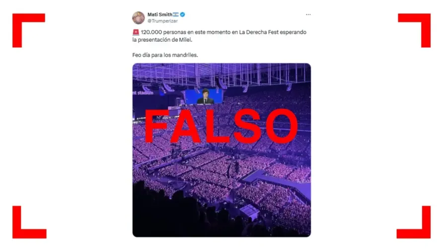 - Pero la foto en realidad fue tomada durante un concierto de la cantante Taylor Swift en Estados Unidos, en 2023. Según reportes periodísticos, al evento libertario asistieron unas 2.500 personas.