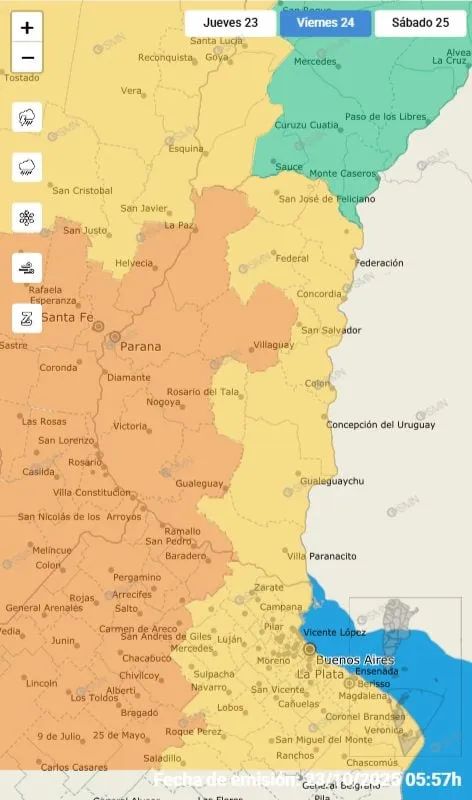 El alerta naranja se informó especialmente para este viernes de mañana en siete Departamentos: Paraná, La Paz, Diamante, Nogoyá, Villaguay, Victoria y Gualeguay.