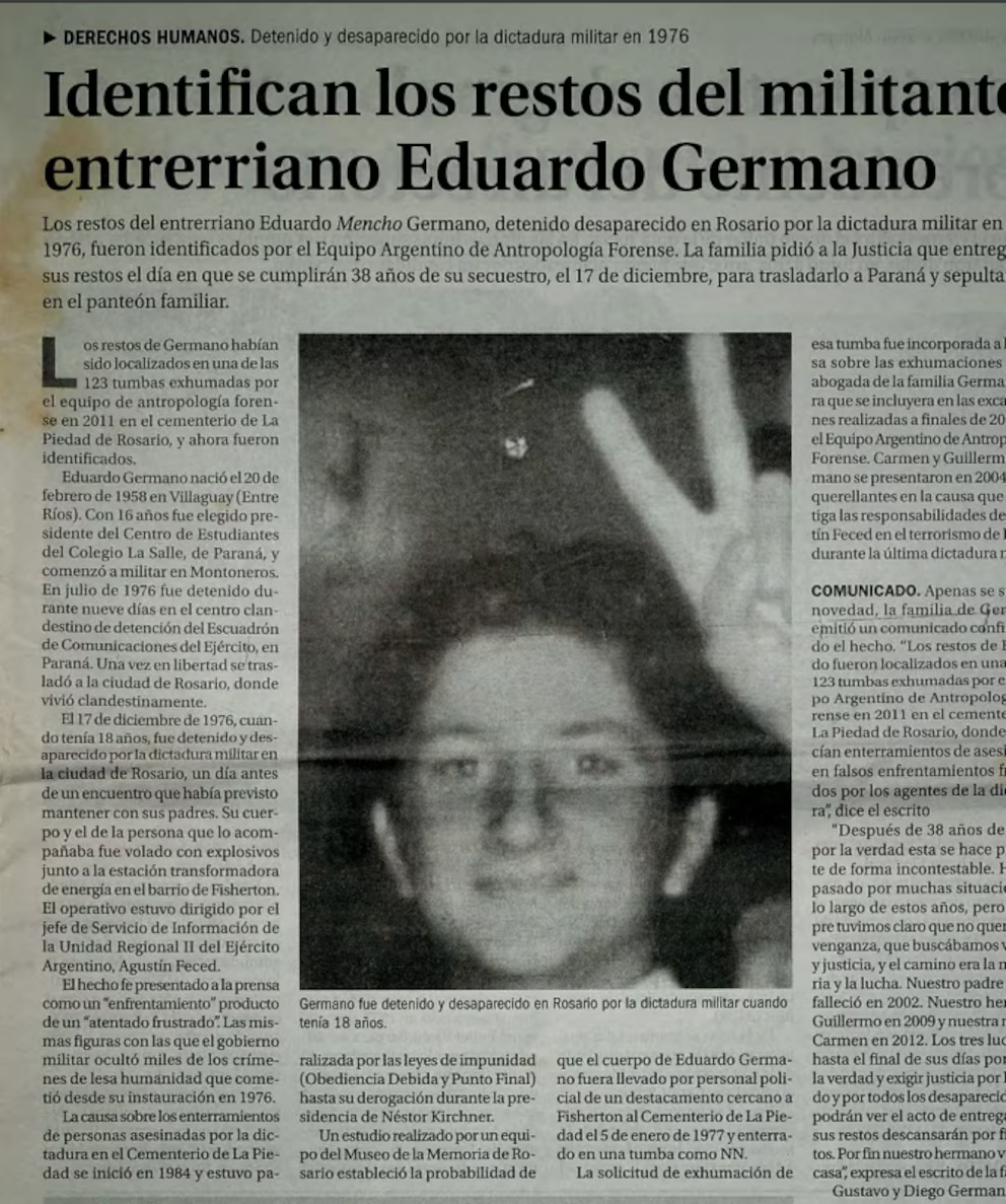 En 2014 el Equipo Argentino de Antropología Forense identificó los restos de Eduardo Germano. Habían sido sepultados en el cementerio La Piedad, de Rosario (Contradesaparecido - Gustavo Germano)