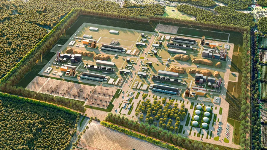 Representación gráfica simulada (render) de la planta de e-Combustible HIF Paysandú. Esta iniciativa generó un conflicto ambiental y social entre ambos países.