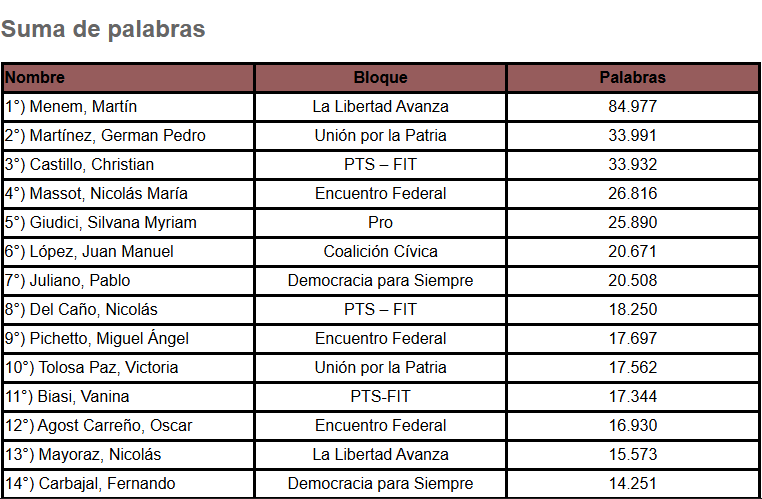 Su posición se explica en parte por su rol institucional al dirigir las sesiones y conceder la palabra a los legisladores. Entre quienes más intervinieron también se ubicaron el jefe del bloque de Unión por la Patria, Germán Martínez, con 33.991 palabras, y el diputado del Frente de Izquierda Christian Castillo, con 33.932.