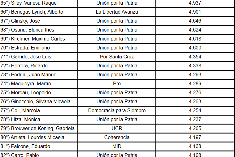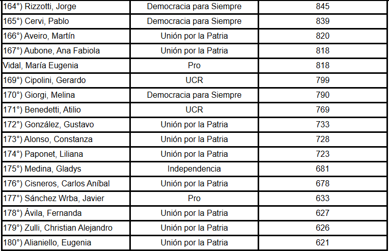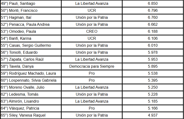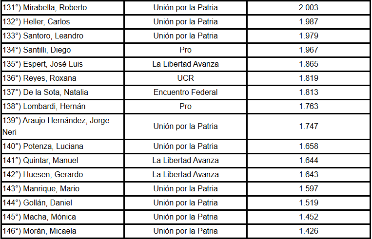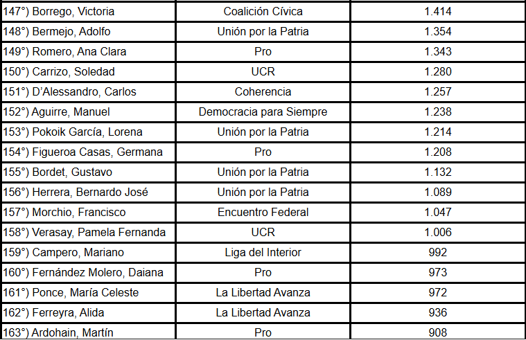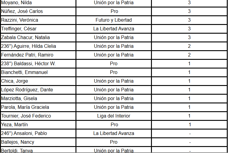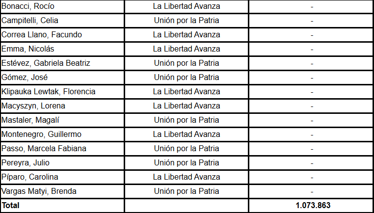 También aparecen diputados de Unión por la Patria: Tanya Bertoldi, Celia Campitelli, Gabriela Estévez, José Gómez, Magalí Mastaler, Marcela Passo, Julio Pereyra y Brenda Vargas Matyi.
