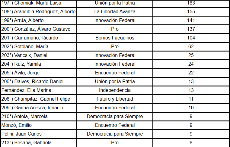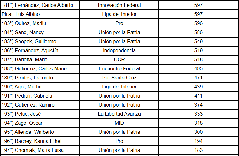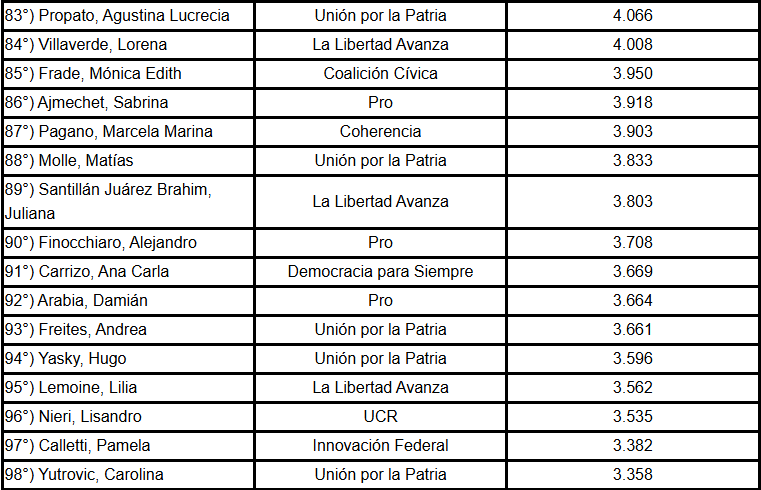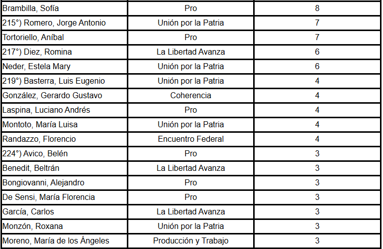 Entre ellos figuran María Sotolano, del PRO, con 62 palabras; Daniel Vancsik y Yamila Ruiz, de Innovación Federal, con 25 y 24 respectivamente; y Jorge Ávila, de Encuentro Federal, con 22.