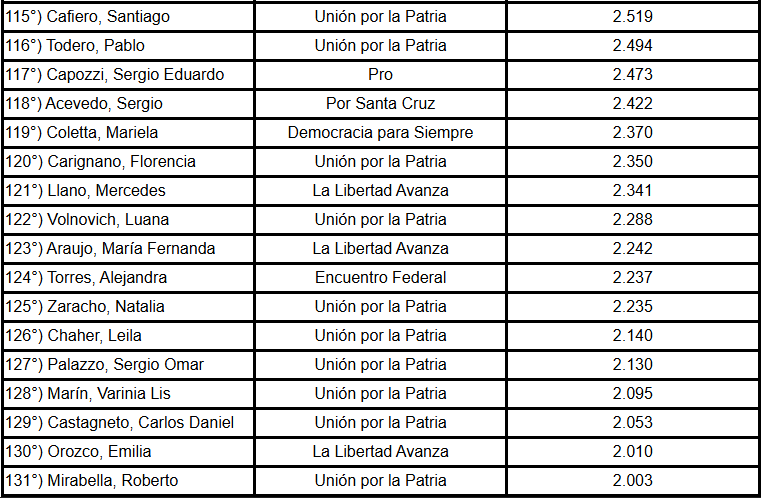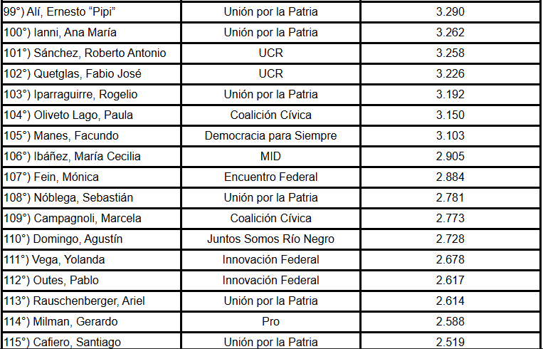 En el nivel más bajo del registro aparecen intervenciones casi simbólicas. Hilda Aguirre y Ramiro Fernández Patri dijeron apenas dos palabras en todo el año. Y Héctor Baldassi, Emmanuel Bianchetti, Jorge Chica, Dante López Rodríguez, Gisela Marziotta, María Graciela Parola, José Federico Tournier y Martín Yeza quedaron anotados con una sola palabra durante 2025.