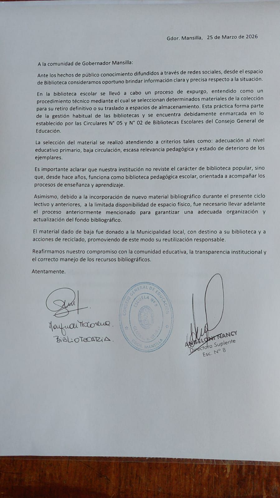 “Es importante aclarar que nuestra institución no reviste el carácter de biblioteca popular, sino que, desde hace años funciona como biblioteca pedagógica escolar, orientada a acompañar los procesos de enseñanza y aprendizaje.