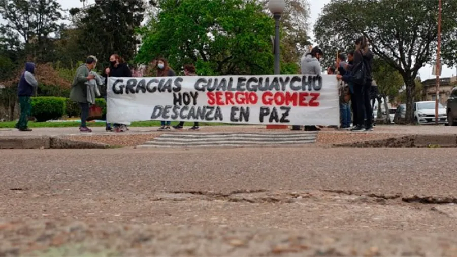Los familiares y amigos de la víctima acompañaron en silencio la extensa espera de un veredicto de pena, con una bandera que decía "Gracias Gualeguaychú hoy Sergio Gómez descansa en paz".
