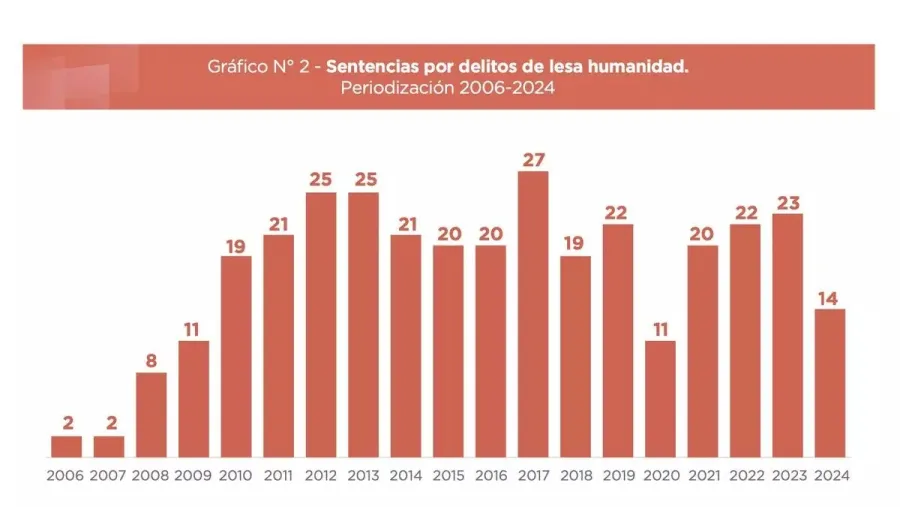 En 2024 sólo hubo 14 sentencias por delitos de lesa humanidad, el promedio mas bajo de los últimos 10 años, sacando 2020, el año de la pandemia. Procuraduría de Crímenes contra la Humanidad