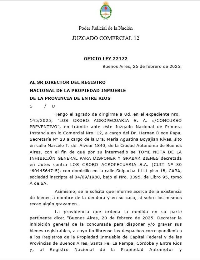 En febrero, el juez Papa notificó al Registro de la Propiedad Inmueble de Entre Ríos para que identifique los inmuebles a nombre de Los Grobo y Agrofina y comunicó la inhibición general para disponer y gravar dichos bienes en el marco del concurso.