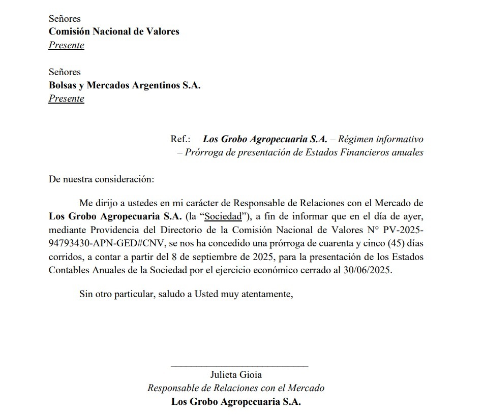 Además, recientemente se conoció que la Comisión Nacional de Valores (CNV) concedió una prórroga de 45 días a partir del 8 de septiembre para la presentación de los Estados Contables Anuales de la Sociedad por el ejercicio económico cerrado al 30 de junio de 2025. La información fue comunicada por Julieta Gioia, Responsable de Relaciones con el Mercado de la firma, según se verifica en el sitio del ente que regula el mercado de capitales.