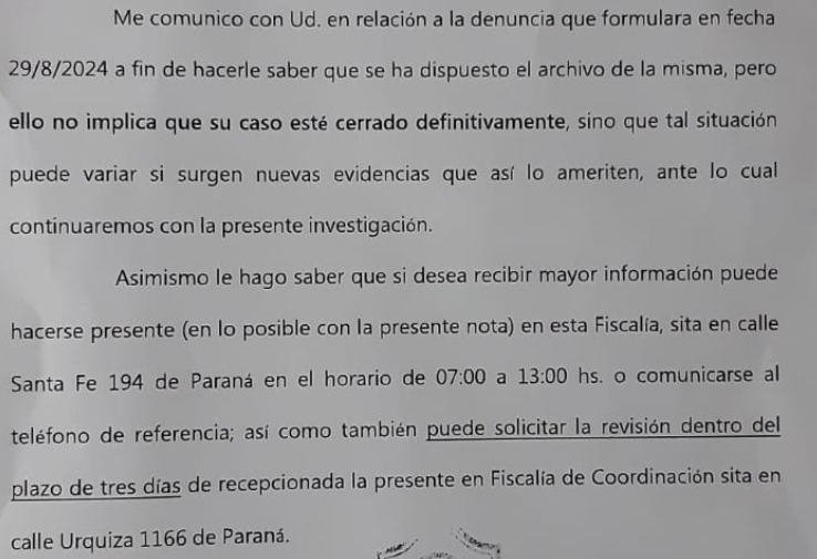 La decisión fue comunicada este lunes a la denunciante mediante una notificación oficial firmada por la agente fiscal María Florencia Acuña, en la que se informó: “Me comunico con Ud. en relación a la denuncia que formulara en fecha 29 de agosto de 2024 a fin de hacerle saber que se ha dispuesto el archivo de la misma, pero ello no implica que su caso esté cerrado definitivamente, sino que tal situación puede variar si surgen nuevas evidencias que así lo ameriten, ante lo cual continuaremos con la presente investigación”.