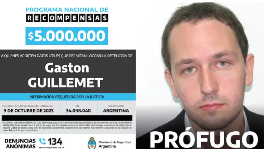 Para los detectives judiciales que están tras sus pasos es considerado el prófugo más buscado. Hace 23 meses, a poco de asumir como ministra de Seguridad del gobierno de Javier Milei, Patricia Bullrich dispuso una recompensa de $5.000.000 para quien aporte datos que permitan su ubicación y detención. Pero pasó el tiempo y el empresario Gastón Guillemet todavía no fue atrapado. Tiene una orden de captura nacional e internacional por una causa de trata de personas: lo acusan de engañar a adolescentes y jóvenes con promesas laborales para después prostituirlas. Las víctimas tenían 14, 17 y 19 años.