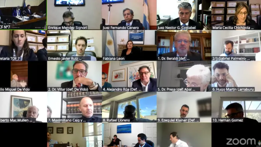 En esta tercera audiencia del debate oral, Méndez Signori, Fernando Canero y Germán Castelli se conectaron desde la sala de audiencias del Tribunal en el Palacio de Justicia y los demás participantes por Zoom.
