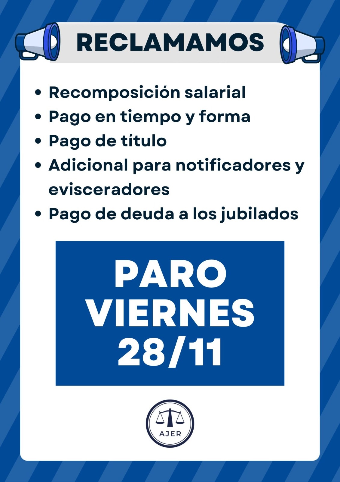 Ante la falta de respuesta del gobierno provincial al reclamo de recomposición salarial solicitado por la Mesa Salarial del Poder Judicial, la Asociación de Judiciales de Entre Ríos (AJER) convocó a paro total de actividades para este viernes 28 de noviembre.