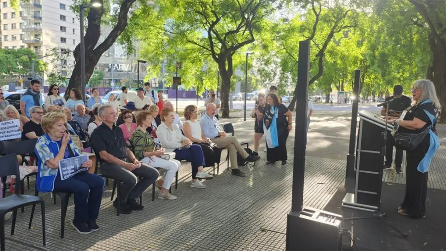 En un acto por el 11° aniversario del crimen de Nisman, su madre Sara Garfunkel (camisa blanca en el centro), la fiscal Cecilia Goyeneche y el legislador Waldo Wolff.