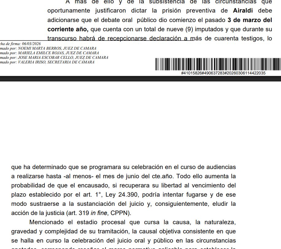 La decisión fue firmada por los jueces Noemí Berros, Mariela Rojas y José Marcía Escobar Cello, quienes dispusieron prorrogar la prisión preventiva al considerar que existe riesgo de fuga si el imputado recupera la libertad. Actualmente, Airaldi permanece alojado en la Unidad Residencial VI del penal federal de Ezeiza.