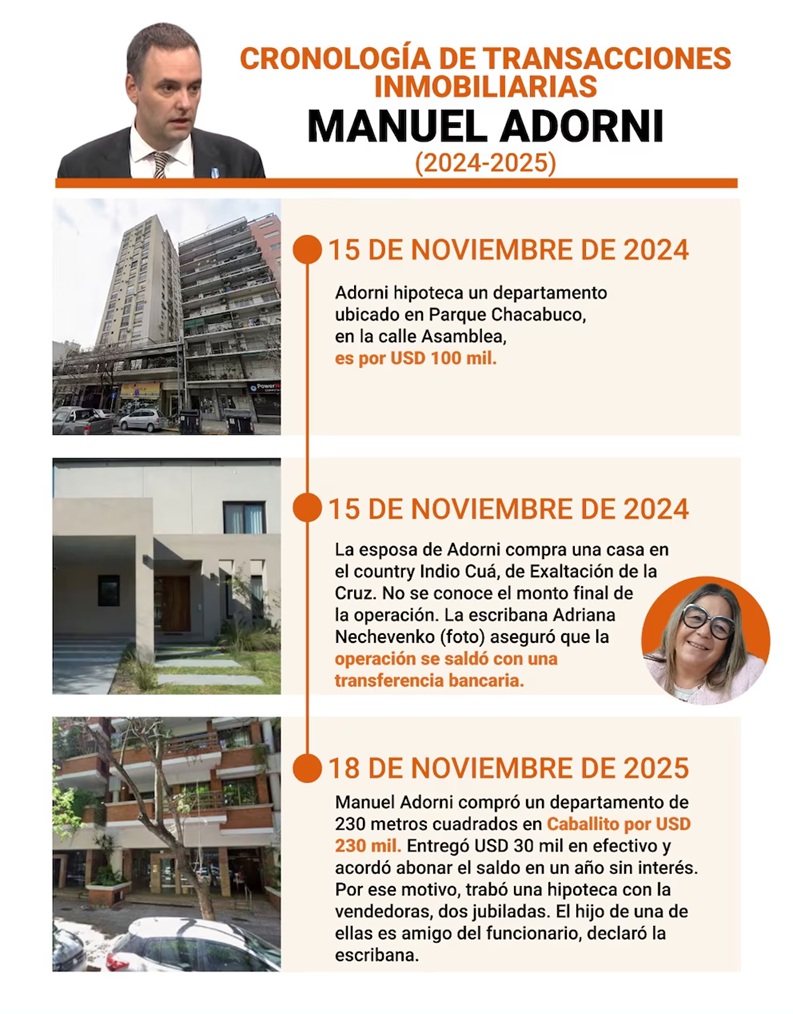 Además la fiscalía busca obtener “toda otra constancia útil para verificar la efectiva existencia, magnitud y sustento económico de las acreencias y financiamientos vinculados, entre otros, con las operaciones relativas a los inmuebles” de Adorni. En relación a estas dos mujeres la escribana del Jefe de Gabinete, Adriana Nechevenko explicó en una entrevista con Infobae que ella las presentó al funcionario porque se dedican a dar préstamos de manera privada.