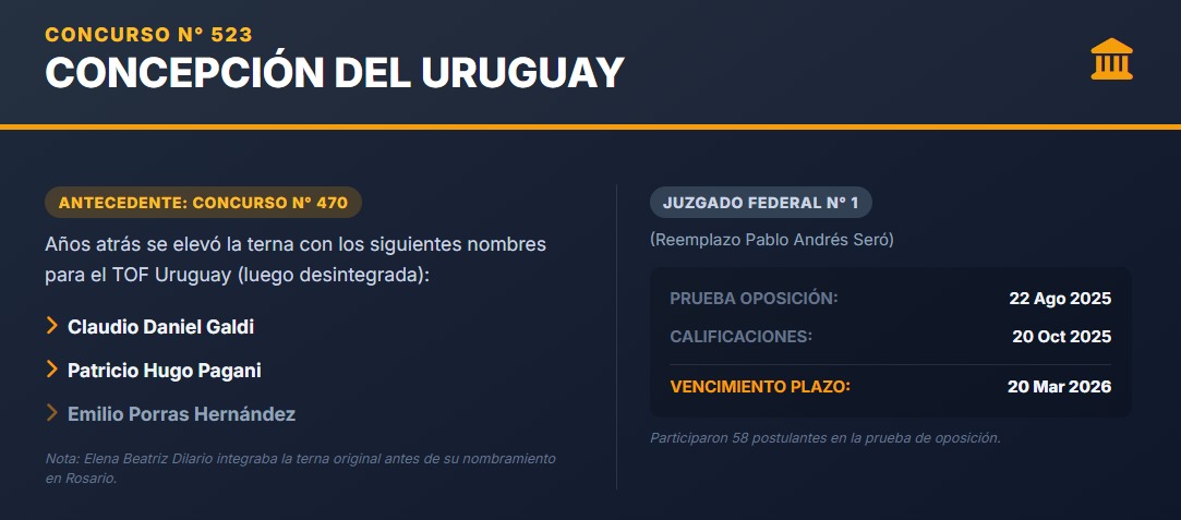 -Concurso N° 523 para un cargo en el Juzgado Federal de Primera Instancia N° 1 de Concepción del Uruguay (es el juzgado donde estaba el fallecido juez Pablo Seró). La prueba de oposición se llevó a cabo el día 22 de agosto de 2025. Se presentaron 58 postulantes. El jurado presentó el informe con las calificaciones el 20 de octubre de 2025. Se espera que se presente ante el Consejo de la Magistratura el informe con la precalificación de los postulantes.