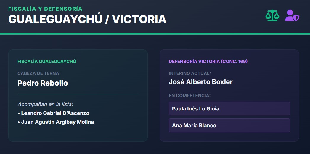 -Defensoría Oficial de Victoria: para este cargo la decisión se dirime entre Paula Inés Lo Gioia, Ana María Blanco y José Alberto Boxler, quien actualmente ejerce la función de manera interina.