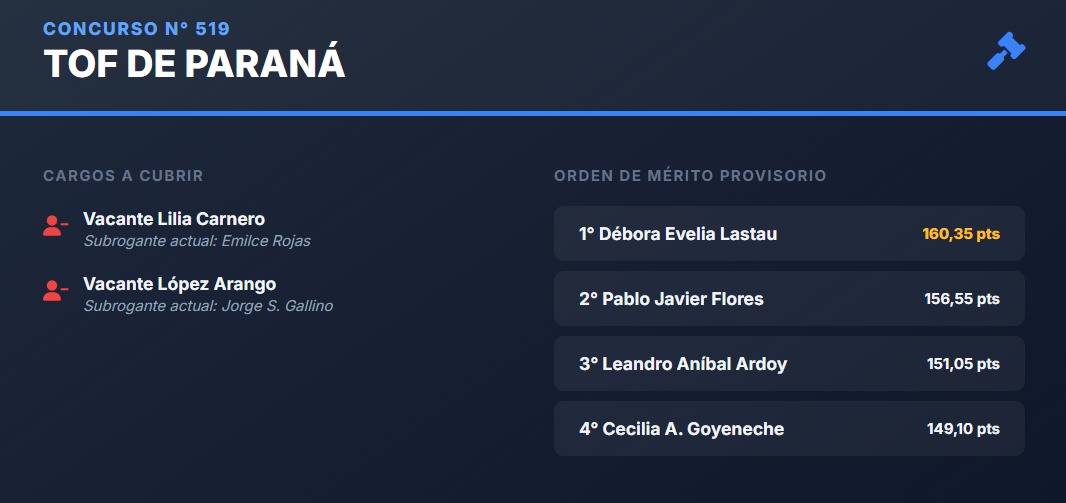 -Concurso N° 519 destinado a cubrir dos cargos de juez/a de cámara en el Tribunal Oral en lo Criminal Federal de Paraná. Una vacante es por la jubilación de la jueza Lilia Carnero (la reemplaza Emilce Rojas) y el lugar de Roberto Manuel López Arango (se jubiló en octubre de 2025, hoy lo reemplaza el juez Jorge Sebastián Gallino). Este trámite yLa orden de Mérito provisorio 1°) Débora Evelia Lastau, con 160,35 puntos 2°) Pablo Javier Flores, 156,55 puntos 3°) Leandro Aníbal Ardoy 151,05 puntos ; 4°) Cecilia Andrea Goyeneche (149,10 puntos) Actualmente se evalúan impugnaciones.