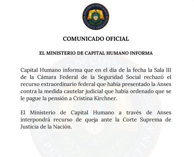 Ante el nuevo revés de la Cámara Federal de la Seguridad Social, Capital Humano afirmó que se presentarán ante la Corte Suprema de Justicia. Mediante un comunicado explicaron el alcance del fallo de la Sala III contra el recurso presentado por ANSES, organismo que integra la cartera nacional.