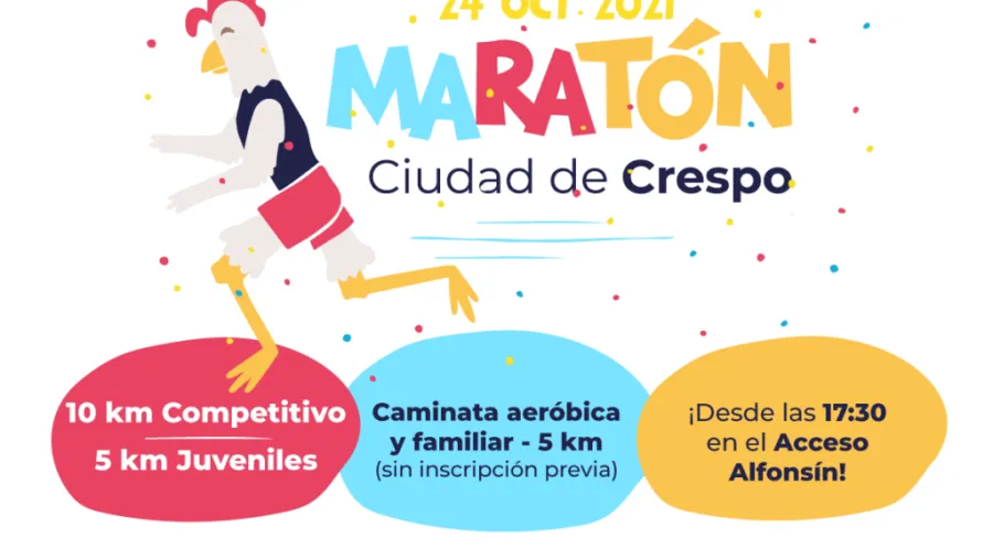 El domingo 24 de octubre, desde las 17.30, se desarrollará una nueva edición de la Maratón Ciudad de Crespo. El punto de largada y llegada será en el Acceso Presidente Raúl Ricardo Alfonsín, frente al predio ferial de la Fiesta Nacional de la Avicultura.