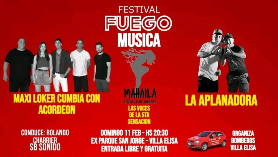 Bomberos Voluntarios de Villa Elisa organizan el Festival Fuego que se hará este domingo 11 de febrero, en el ex Parque San Jorge. La cita es para las 20.30, con entrada libre y gratuita.