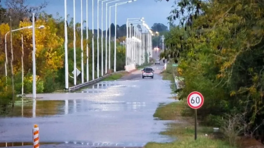 Debido al crecimiento del río Uruguay, parte del asfalto en el acceso a Pueblo Liebig desde la Ruta Provincial 26 se encuentra cubierto por agua.