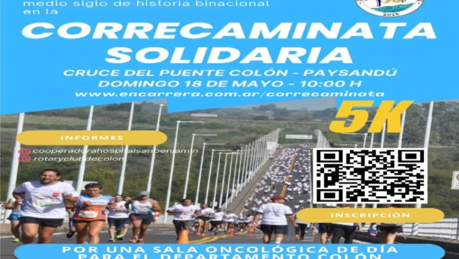 Este domingo 18 de mayo se realizará una “Corre Caminata Binacional Colón–Paysandú”, con motivo del 50° aniversario del Puente Internacional “José Gervasio Artigas” y a beneficio de la Cooperadora del Hospital "San Benjamín" de Colón.