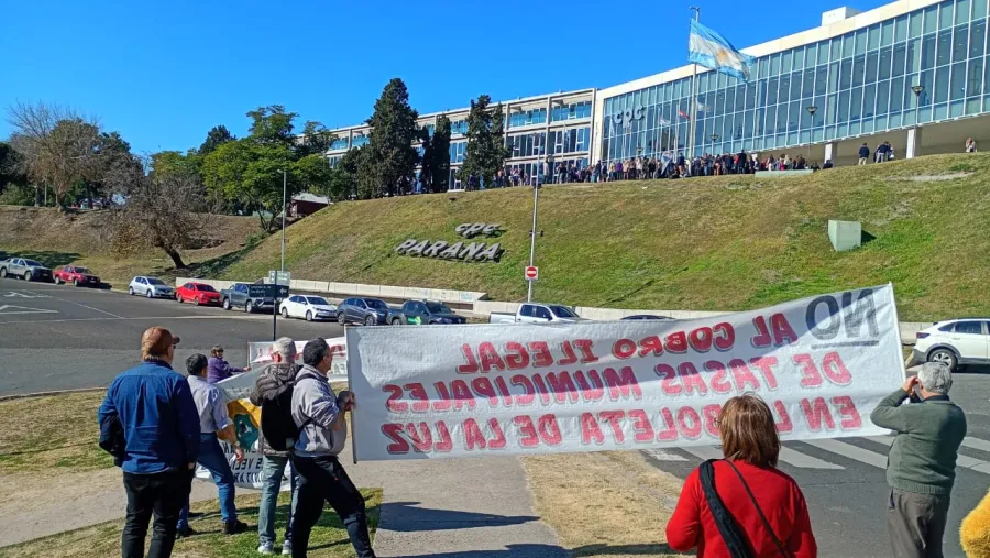 La Asamblea Popular de Paraná por los costos de la energía eléctrica volvió a visibilizar su reclamo por la quita total de tasas municipales en la factura de luz. Lo hizo este martes en las afueras del Centro Provincial de Convenciones (CPC) de Paraná en el marco de la reunión en la que el gobernador Rogelio Frigerio convocó a los intendentes de toda la provincia.