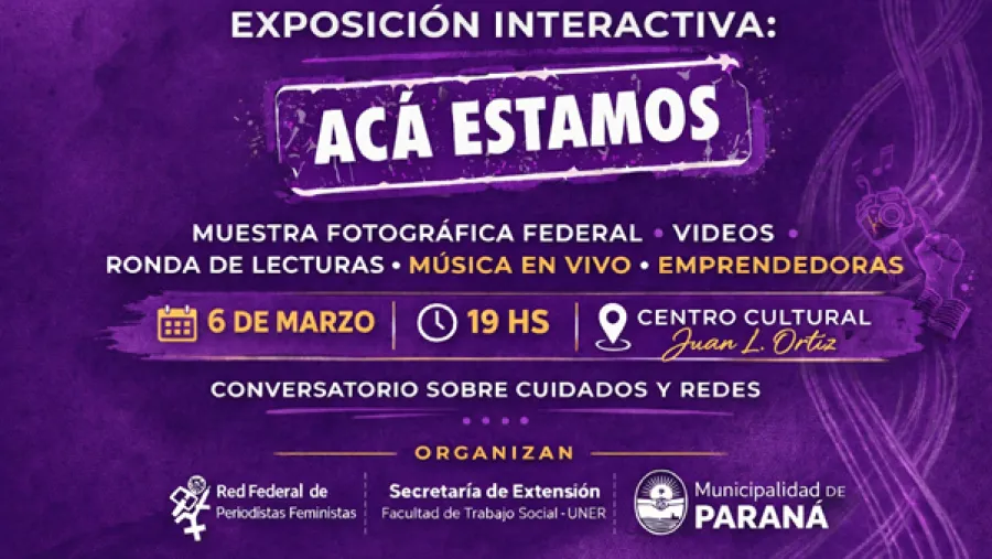 Desde el 6 de marzo, a las 19, el Centro Cultural Juan L. Ortiz será sede de una exposición interactiva feminista que reúne producciones artísticas, testimonios, investigaciones universitarias y experiencias del campo popular de todo el país, en el marco de las actividades que la Municipalidad de Paraná organiza por el 8M. Luego, la muestra continuará abierta desde el 10 hasta el 27 de marzo en la Facultad de Trabajo Social de la Universidad Nacional de Entre Ríos y con posterioridad será presentada en distintos puntos de la provincia.