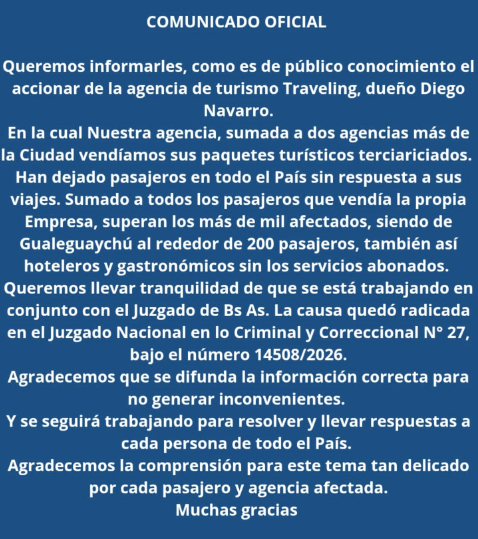 En ese mensaje, la empresa explicó: “Como es de público conocimiento el accionar de la agencia de turismo Traveling, dueño Diego Navarro. Nuestra agencia sumada a dos agencias más de la ciudad vendíamos sus paquetes turísticos tercerizados. Han dejado pasajeros en todo el país sin respuesta a sus viajes".