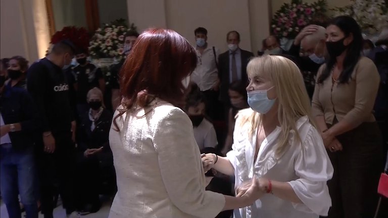 La ex presidenta llegó y, acompañada por el primer mandatario Alberto Fernández y el gobernador bonaerense, Axel Kicillof, se dirigió a saludar a la familia Maradona. Inmediatamente después, Kirchner, Fernández y Kicillof se acercaron al cajón junto a Claudia Villafañe y Dalma y Giannina Maradona.