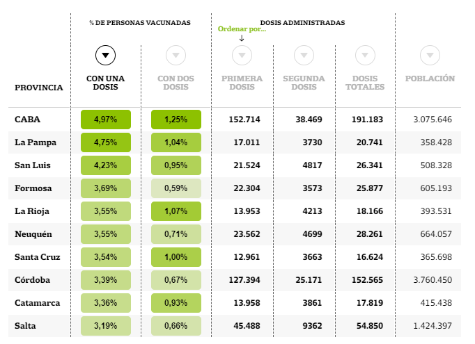 En la escala mundial, la Argentina está en el puesto 77 de porcentaje de la población vacunada, según el ranking que elaboran, a diario, los investigadores de la Universidad de Oxford. Y a nivel regional, quinto. El país está incluso por debajo de la media global que es del 4%. Brasil ya aplicó dosis equivalentes a más del 5% de sus habitantes; Alemania, a casi el 10%, y Chile, a más del 26%.