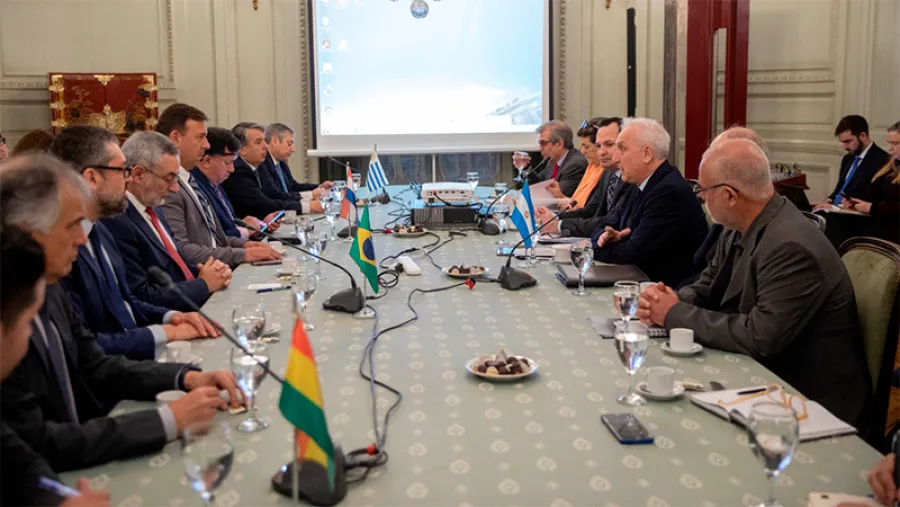 Los embajadores de la Argentina, Bolivia, Brasil, Paraguay y Uruguay, países signatarios del Acuerdo de Santa Cruz de la Sierra, dialogaron hoy sobre los aspectos jurídicos, técnicos y comerciales que rigen el transporte fluvial por la Hidrovía Paraguay-Paraná.