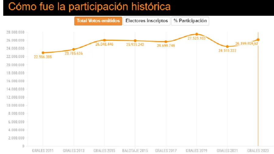 El Observatorio de Política Electoral del Ministerio del Interior detalla que, desde el retorno de la democracia, la participación electoral siempre estuvo por encima del 70%, con la única excepción en las elecciones legislativas de 2021, que se hizo en medio de la pandemia por el Covid. En ese momento, la participación fue del 68% del padrón, la elección con más baja participación de las últimas décadas.