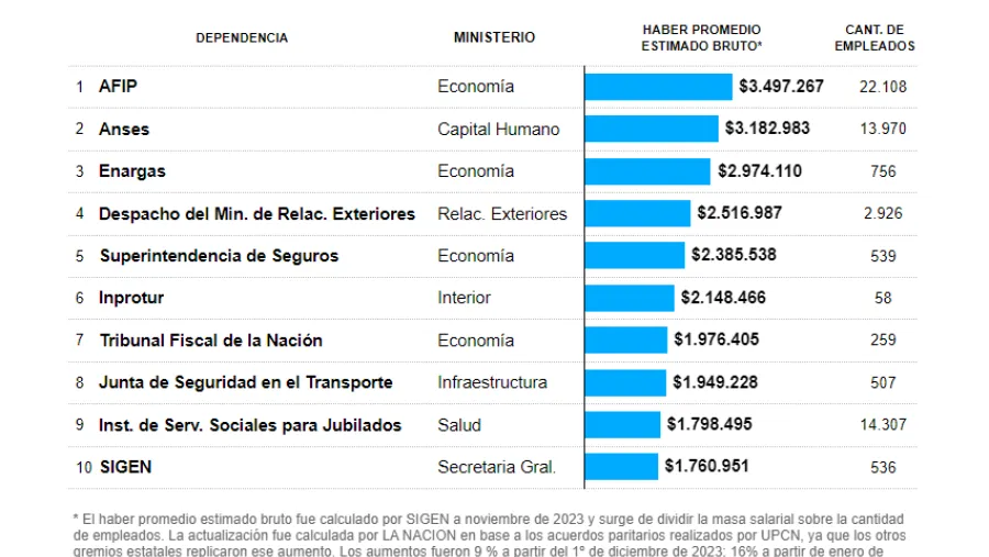 Ese trabajo contiene un repaso de varias cifras, entre ellas el cálculo de los “haberes promedio estimado bruto”, tal como lo denomina la Sigen, de acuerdo al sueldo de noviembre de 2023. De acuerdo a lo que se aclara en cada uno de los informes, ese monto surge de dividir la partida destinada a haberes por la cantidad de empleados en la nómina. Ese es el dato oficial promedio que La Nación tomó de base para el cálculo. Luego, se aplicaron los aumentos que negoció la Unión Personal Civil de la Nación (UPCN), y de esta manera, se actualizaron para llegar al monto actual.