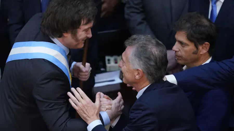 Mauricio Macri saluda a Javier Milei en su asunción presidencial, con Axel Kicillof a su derecha.