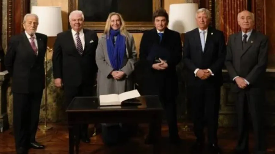 Javier y Karina Milei se trasladaron al mediodía a la sede de la institución, en la calle Alvear al 1.300 en el barrio de Retiro, luego de haber participado por la mañana en la AMIA del acto por el aniversario del atentado contra la mutual judía.